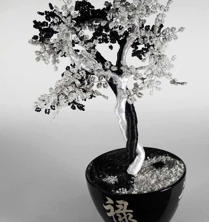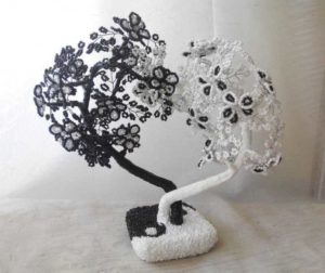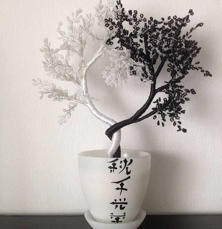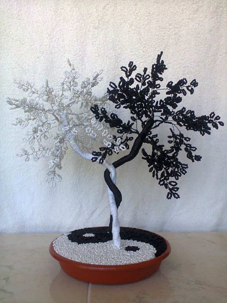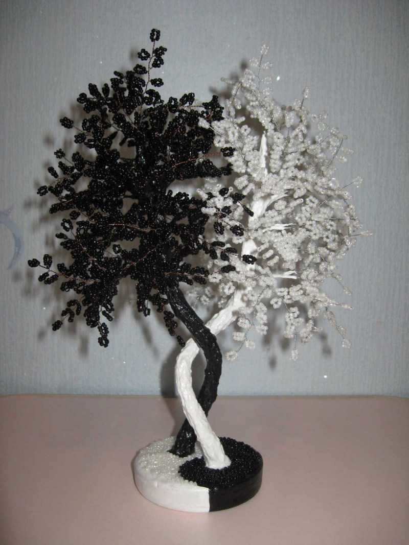 За направата на това ин-ян дърво ще са ви необходими две различни по цвят мъниста - едно бяло и едно черно. Освен това трябва да се подготвят черни и бели конци и средно дебела тел. За да създадете цялостна композиция, ще трябва да преплетете няколко подобни дървета и след това да ги съедините. Ще трябва да използвате тъкане с копчета.