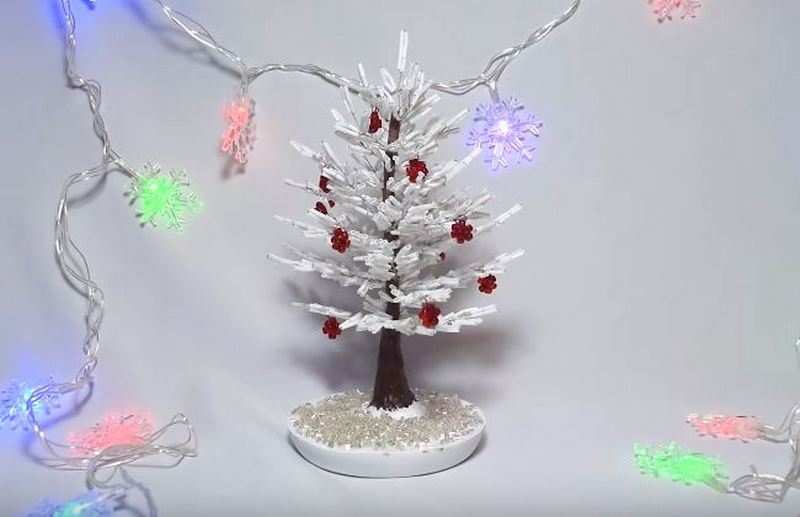 Ще се получат 15 връзки, от които трябва да се оформят 5 големи клончета. Омотайте всичко с кафява панделка, за да създадете кора. Сега трябва само да свържете всичко в едно дърво. След това можете да го оцветите по желание.