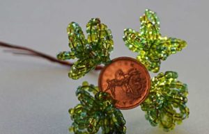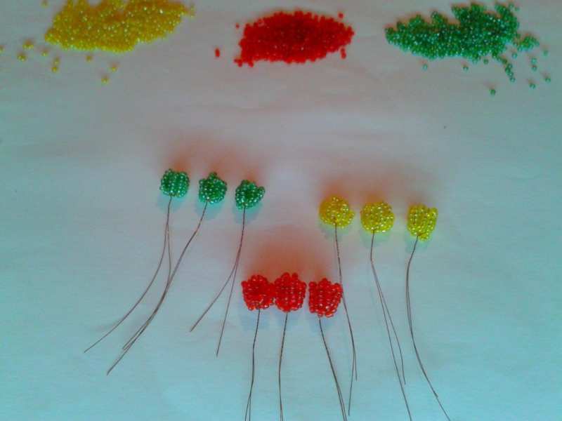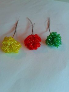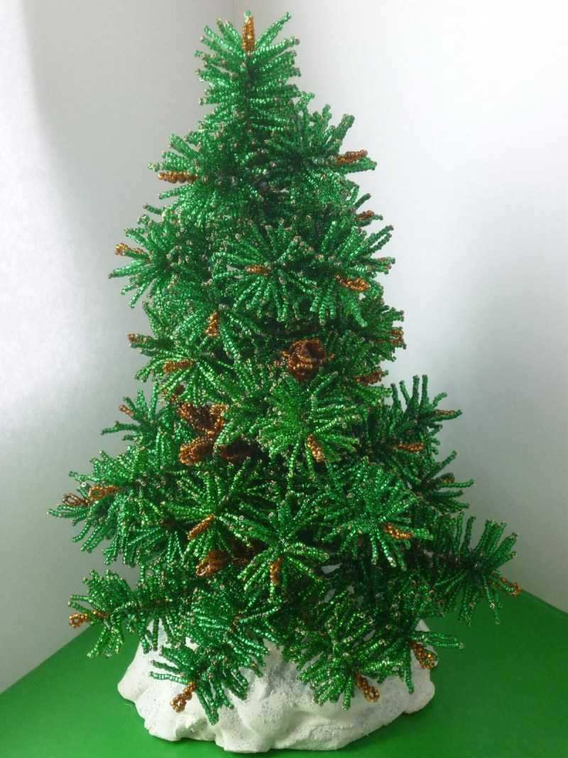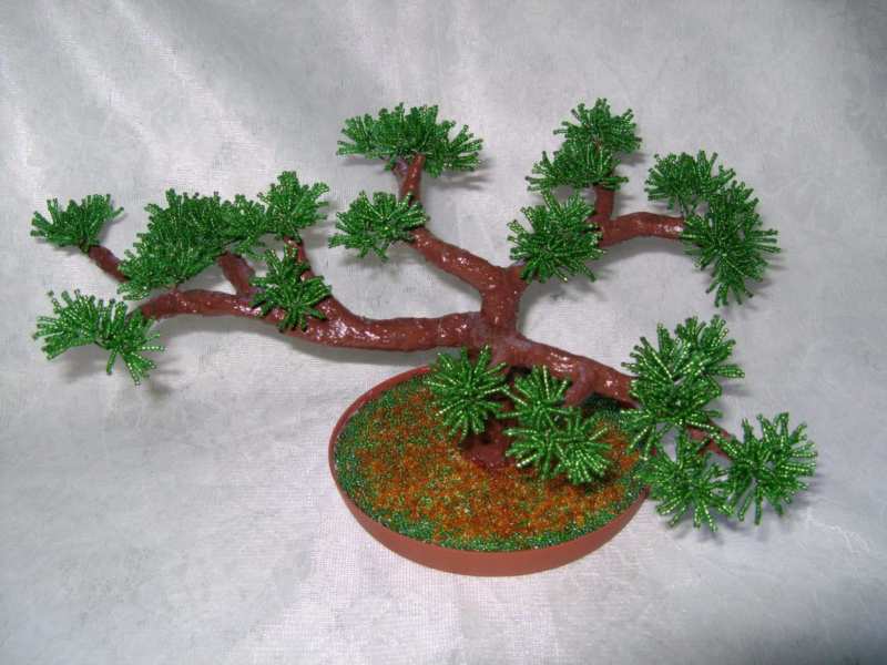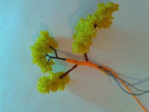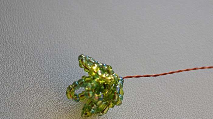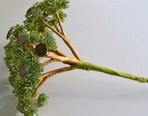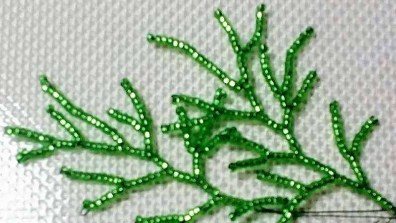 Този занаят е малко по-сложен от предишния, така че ще трябва да се въоръжите с търпение. Необходими са ви мъниста в различни нюанси на зеленото. Първо трябва да оформите клоните на дървото. Нанижете дванадесет мъниста на тел и я усучете на примка. Направете осем от тези клонки и ги зашийте заедно.