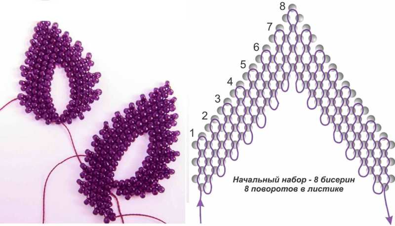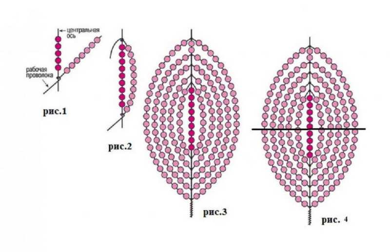 - Плосък паралел. Тази техника е изключително популярна и подходяща за начинаещи. Плоското паралелно тъкане може да се използва за създаване на листа и венчелистчета в композиция. Телта се прокарва през мънистата, както е показано на схемата, като се създава втори ред, успореден на първия.