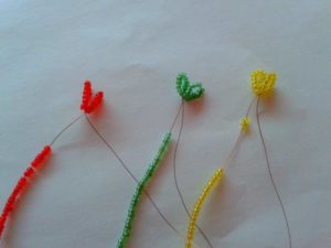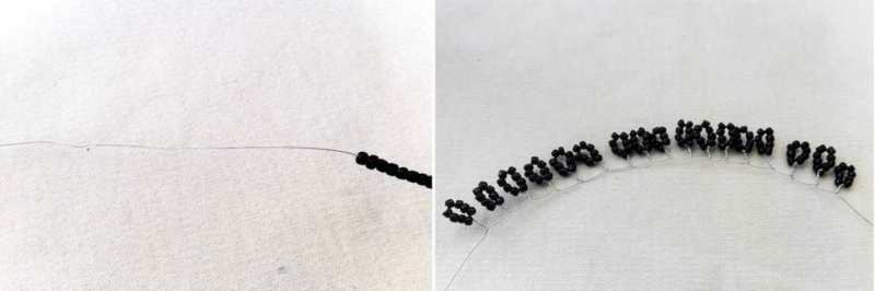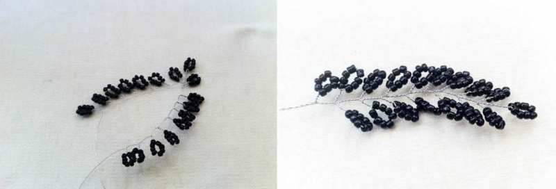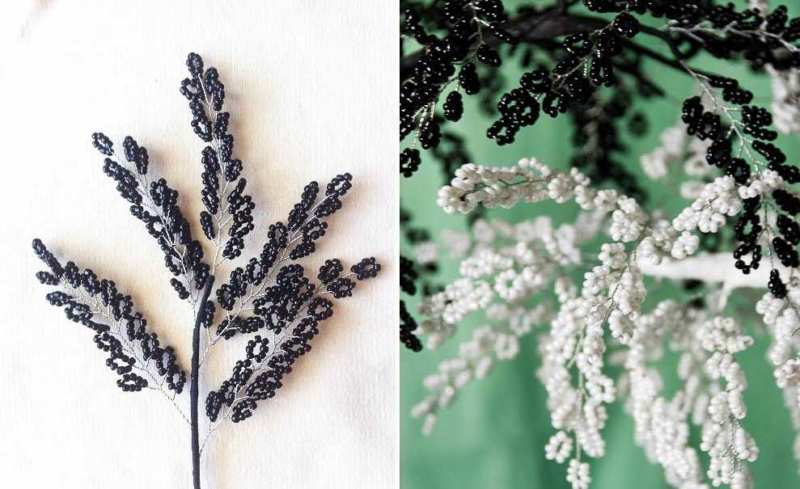 - Френско тъкане. Тук мънистата се нанизват от двете страни на въдицата и образуват дъги, които се захващат за най-външните мъниста. Благодарение на тази техника занаятчиите изработват цветя, листа от дървета.