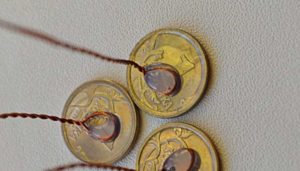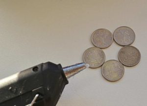 Направете шестдесет от тези елементи. Залепете различни видове монети върху двадесет от тях. След това направете корона, като усучете пет клончета (едно с монета и четири обикновени клончета).
