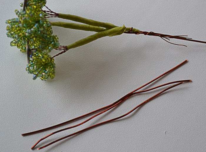 Направете седем еднакви примки на интервали от един сантиметър. Вземете парчето за средното му листо и го огънете наполовина, след което го усучете. Направете тридесет такива клончета, след което ги разделете на купчинки, всяка от които ще има три части.