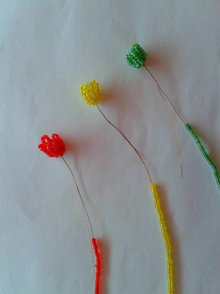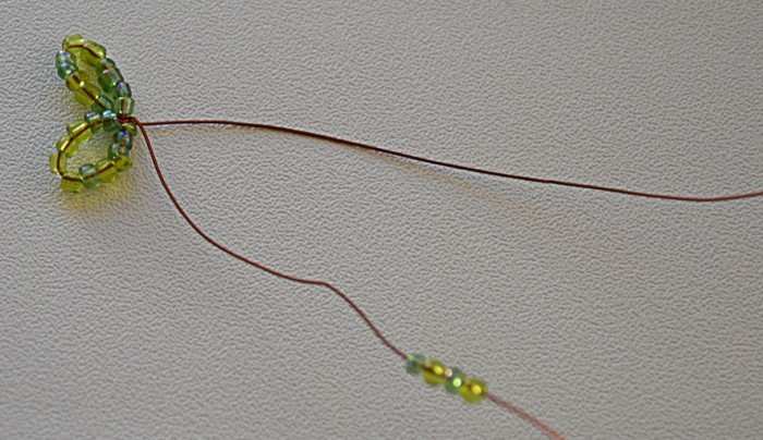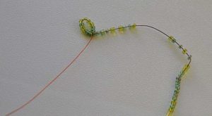 - Ръчна работа. Това е най-простият вариант на тъкане, затова често се използва за изработване на отделни елементи на изделието (например крака на насекоми или тичинки на цветя). Тук трябва да нанижете няколко мъниста на телта, след което да заплетете примката и да я затегнете.