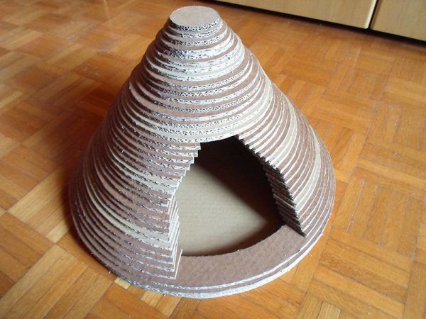 Хижата е атрактивна картонена хижа, която се покрива с плат за тапицерия с помощта на телбод. Този модел на кабина заема малко място в стаята и е най-лесният начин да създадете дом за котката си.
