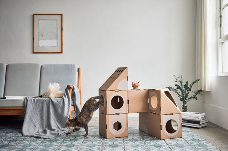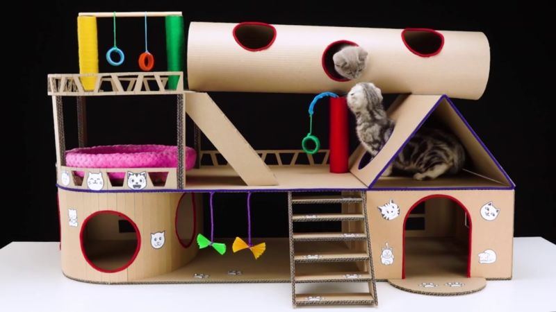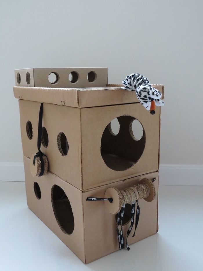 Многоетажни картонени къщи - за разлика от първия вариант, тук се използват няколко кутии, всяка от които представлява следващ етаж. В зависимост от въображението на собственика може да има няколко етажа. Много врати и прозорци трябва да бъдат изрязани, за да може котката да скочи вътре.