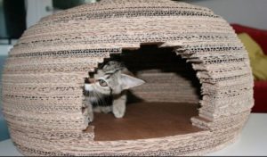 Къщата от гофриран картон е с формата на топка, но са възможни и други варианти. Прилича на пчелен кошер заради вълнообразните слоеве хартия. Котките харесват текстурираната повърхност на материала, с удоволствие го дъвчат и точат ноктите си.