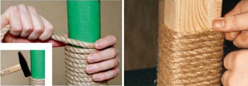 - След това въжето се увива около стойката с помощта на телбод, като се редуват розово и естествено въже.