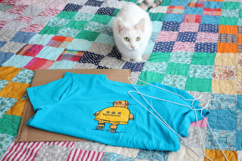 - След това ръкавите на тениската трябва да се издърпат и да се прикрепят отново към картонената рамка с помощта на щифтове. Резултатът трябва да е чиста палатка с равни стени от плат.
