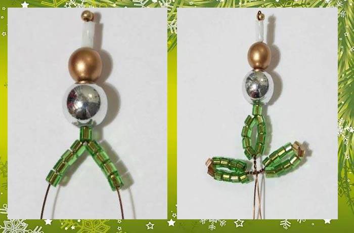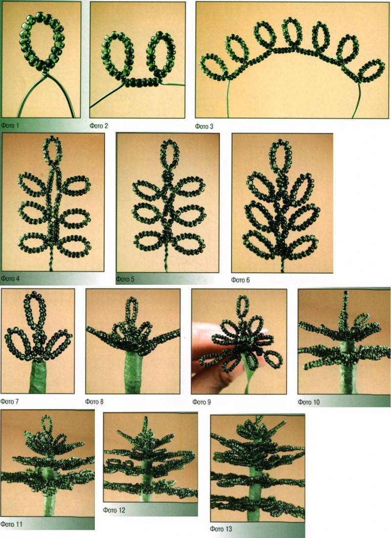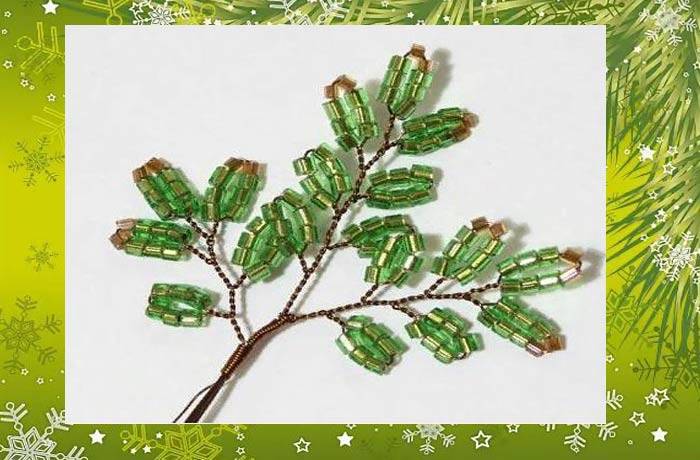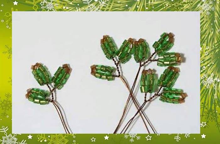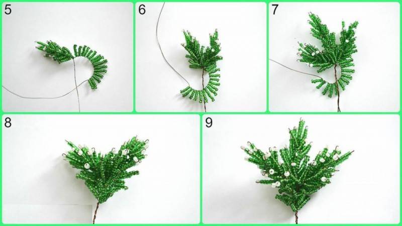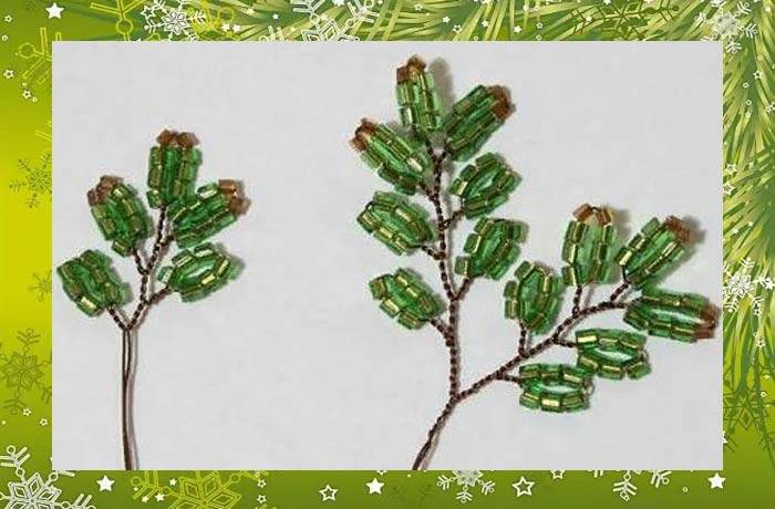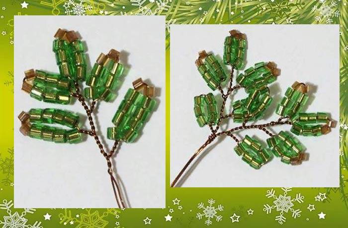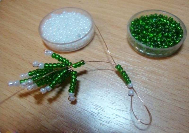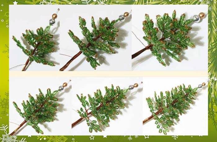 Това е първата лапа на смърчовия клон. След това на всеки край на телта се нанизват още девет мъниста, които трябва да се преместят в първата лапа и да се огъне телта в средата, да се усуче в основата на нова лапа. В крайна сметка трябва да са три.