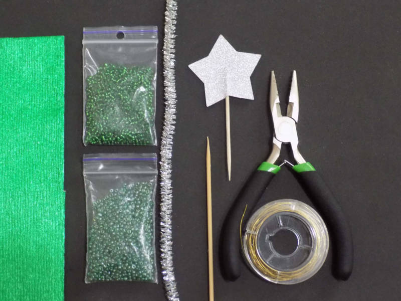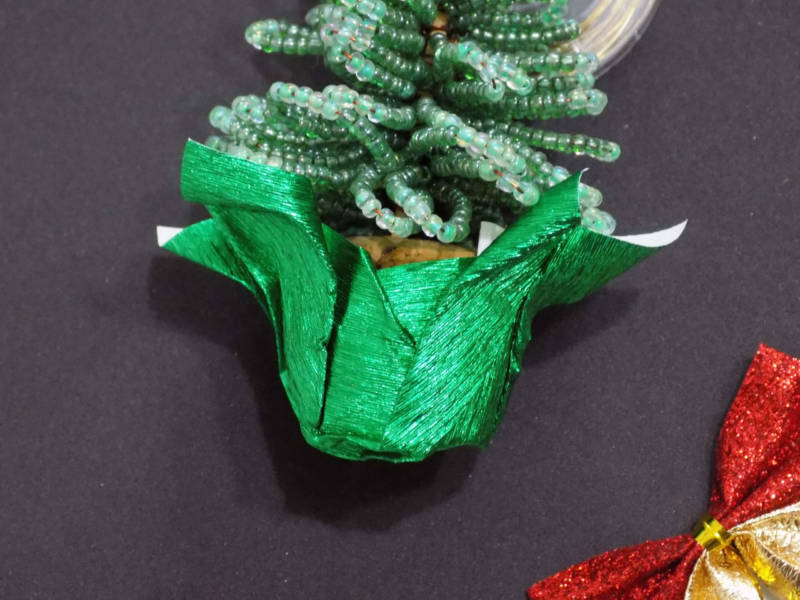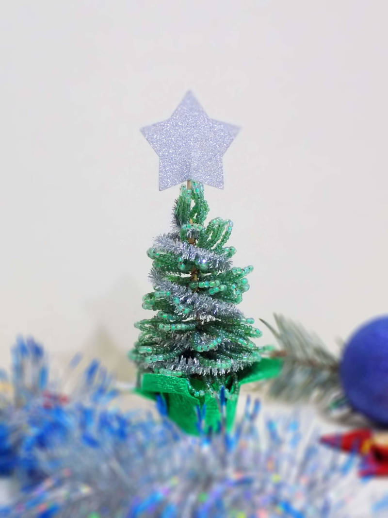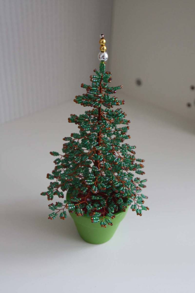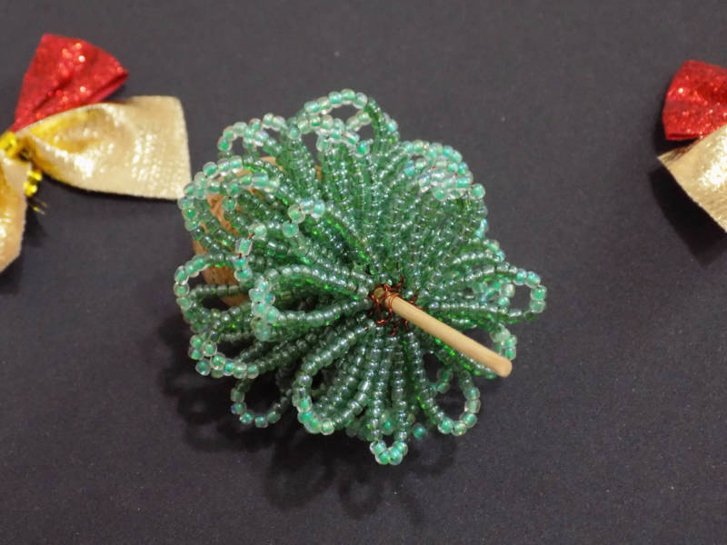 - Резултатът е красив връх на коледна елха. За да не се плъзга по тялото на изделието, трябва да се вземе и закрепи зелено мънисто. За да предотвратите плъзгането му по тялото на самия детайл, ще трябва да вземете зелено мънисто и да го закрепите с него.
