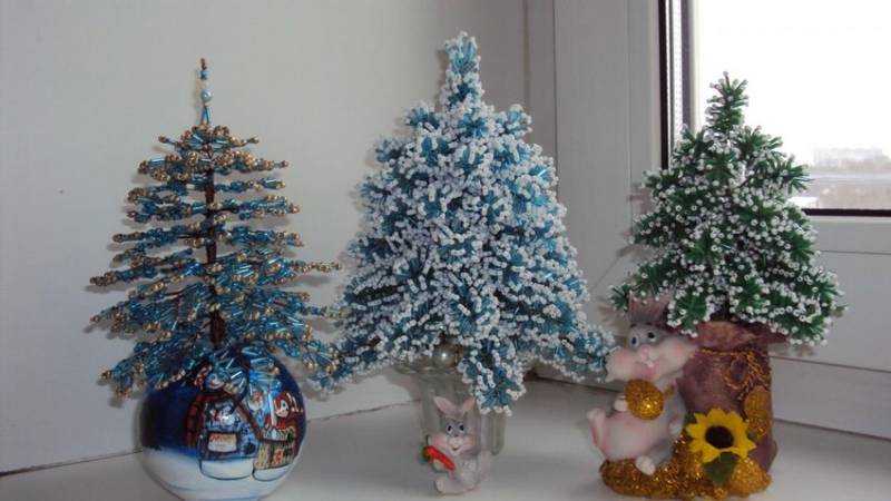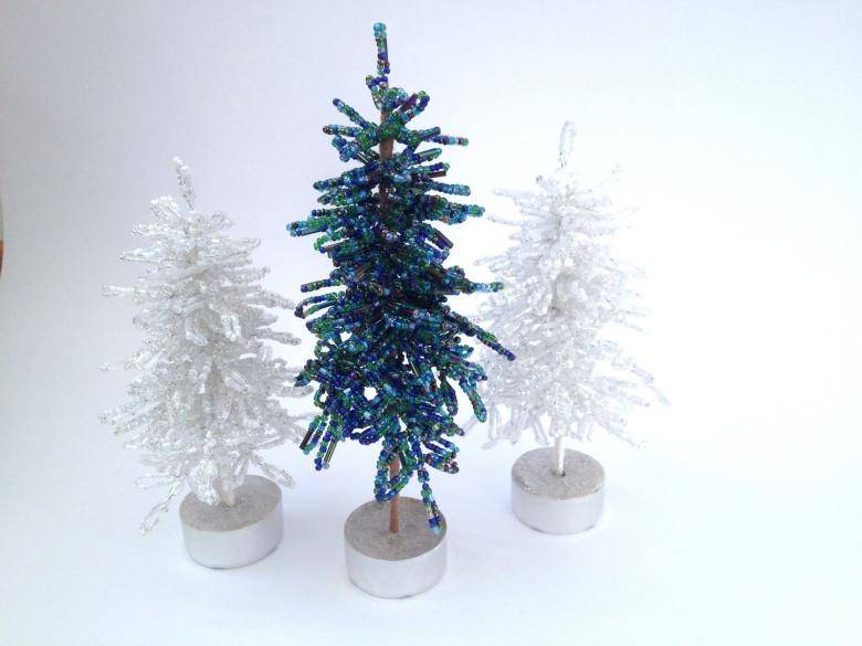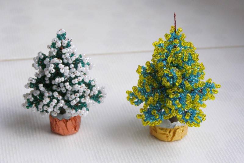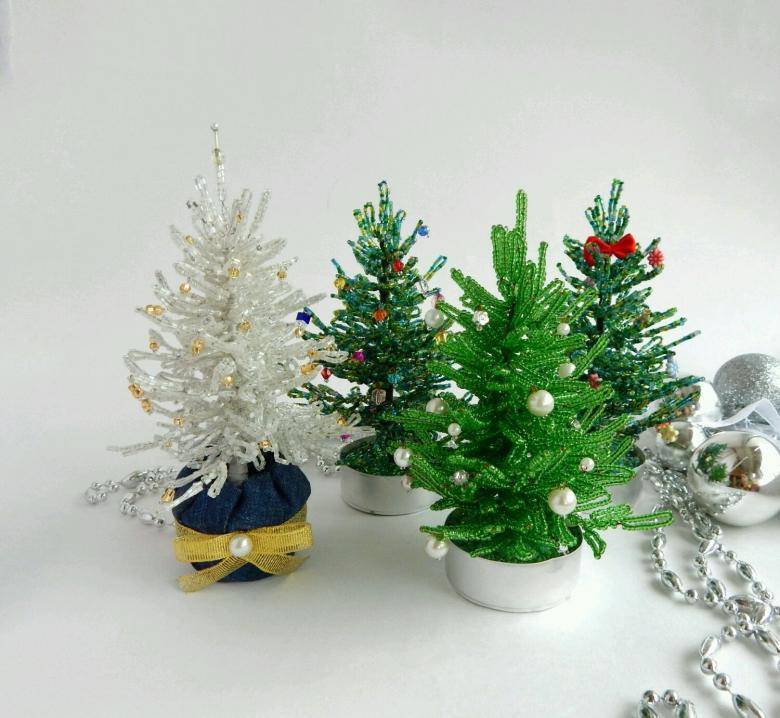 Коледната елха с мъниста сред госпожиците се смята за най-лесната, която може да се създаде от мъниста и допълнителни материали. Изборът им зависи от вида на коледната елха, която трябва да се окаже в края на работата.