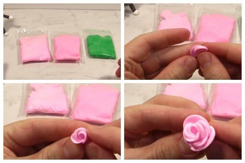 - Откъснете малки парченца глина от розовия цвят. Оформете тънки листенца. Свържете ги в дълга лента, като ги навиете на руло. Това ще бъде центърът на цветето.