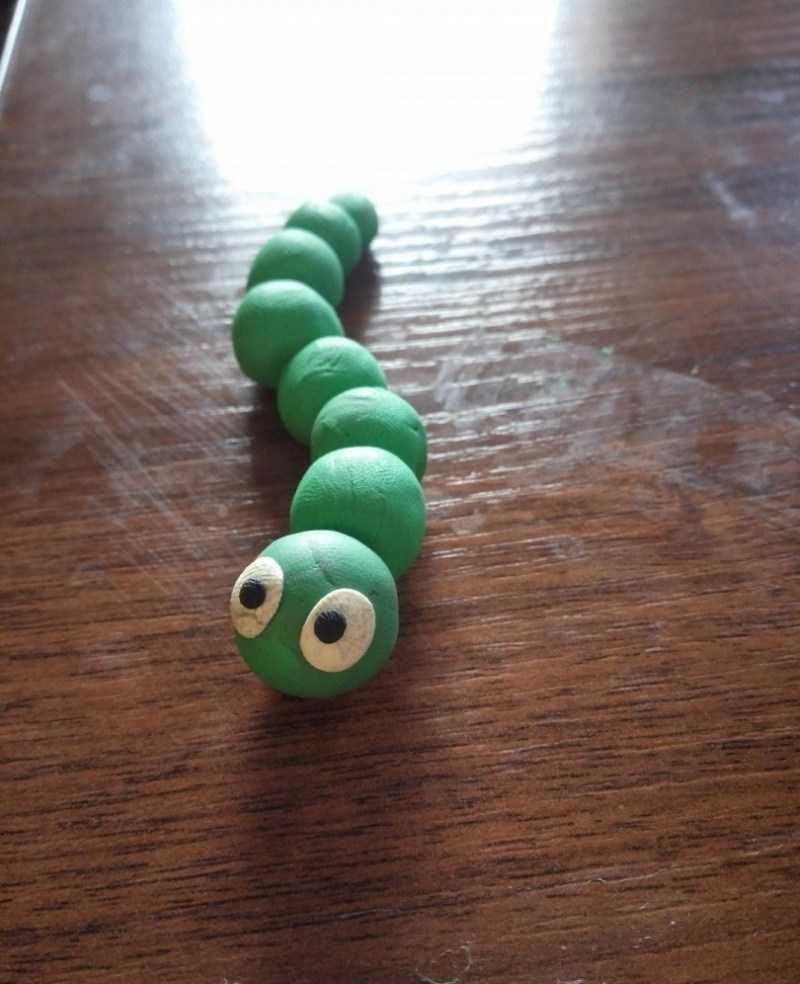 - Свържете кръговете заедно. За целта можете да използвате малки клечки за зъби. Използвайте бяла и черна глина, за да направите очите. Гъсеницата е готова.