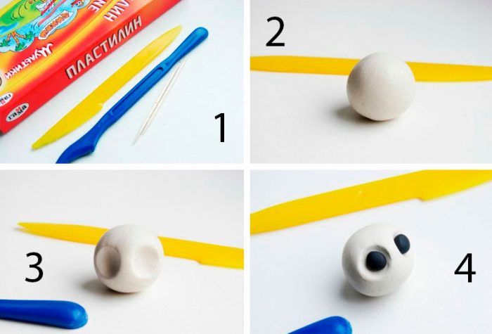 - С помощта на нож отбележете мястото за очите. Използвайте бял пластилин за основата и черен пластилин за учениците.