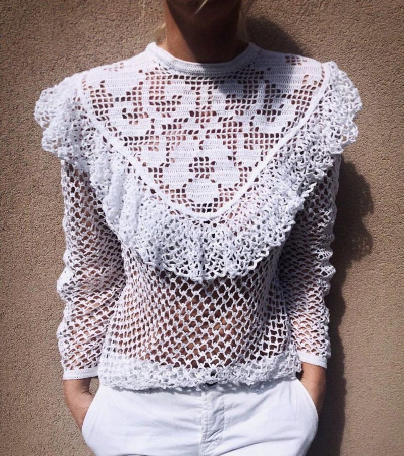 Във всеки случай най-важното е да изберете правилния размер на модела, така че той да изглежда елегантно върху блузата и да пасва напълно на гърба, ламелите и ръкавите. Въпреки че някои части могат да бъдат изработени просто от мрежа, което още повече подчертава елегантността на тази техника.