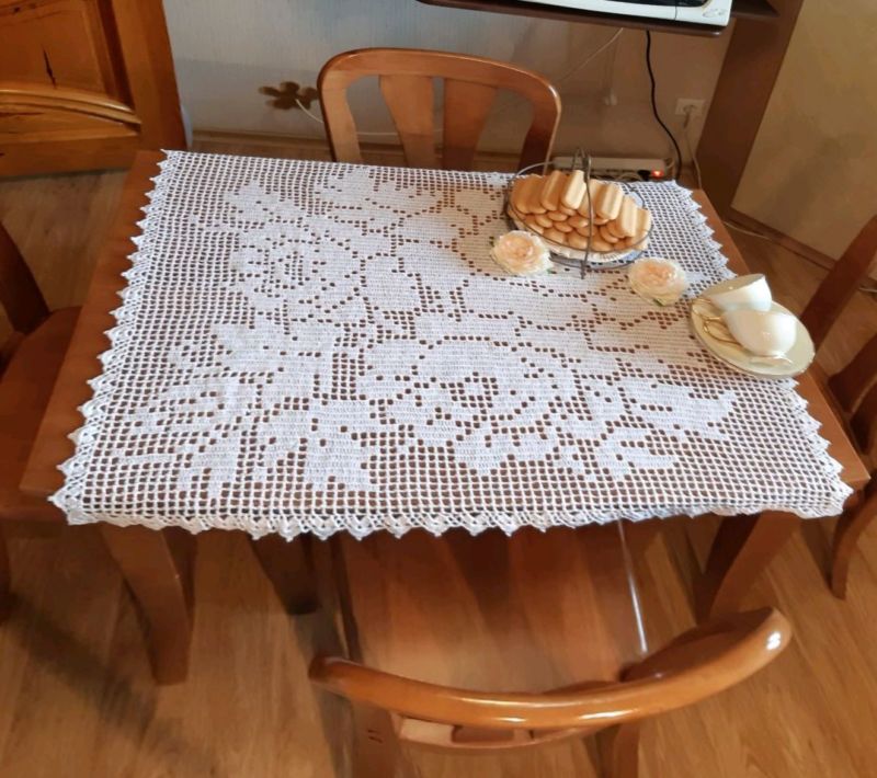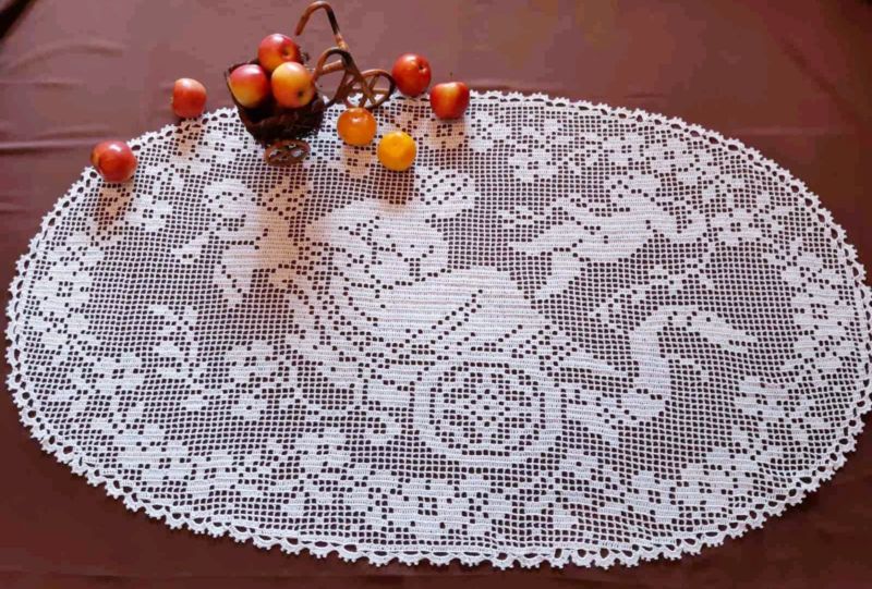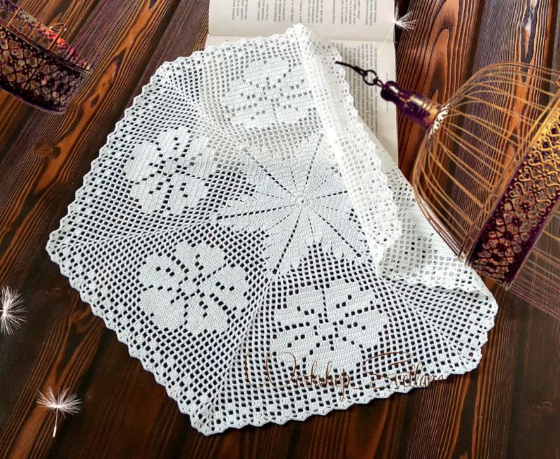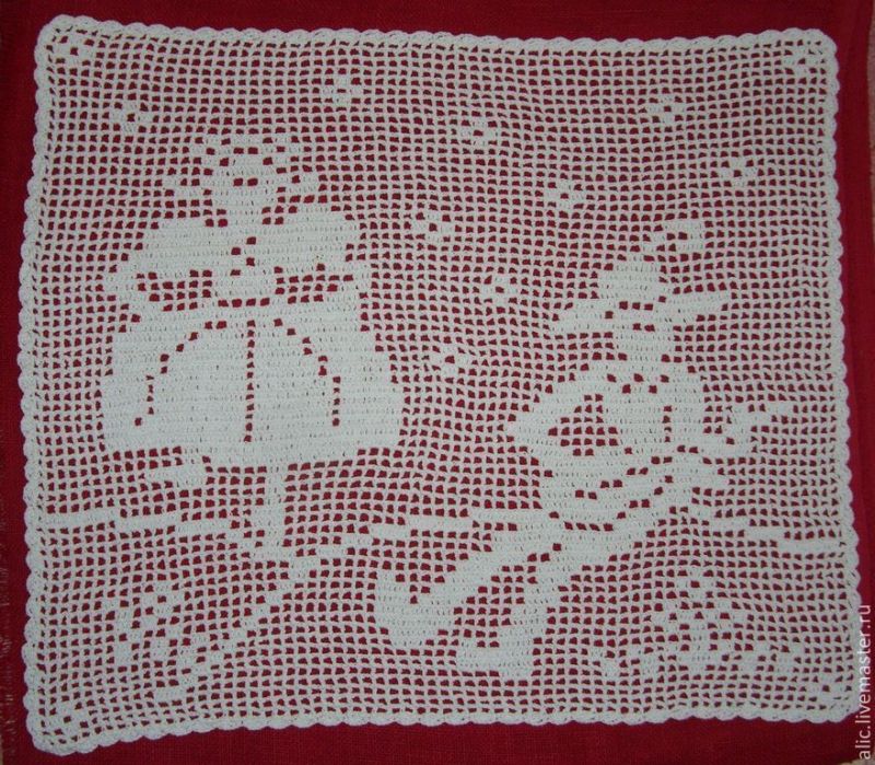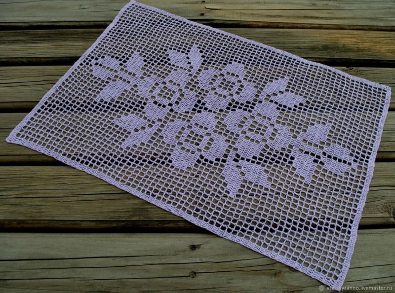 Тази салфетка е за 120 бода височина и 65 бода ширина. Най-добре е да се направи с тънък памучен конец, който е съвсем равномерно положен. По този начин продуктът ще бъде много изящен и елегантен.