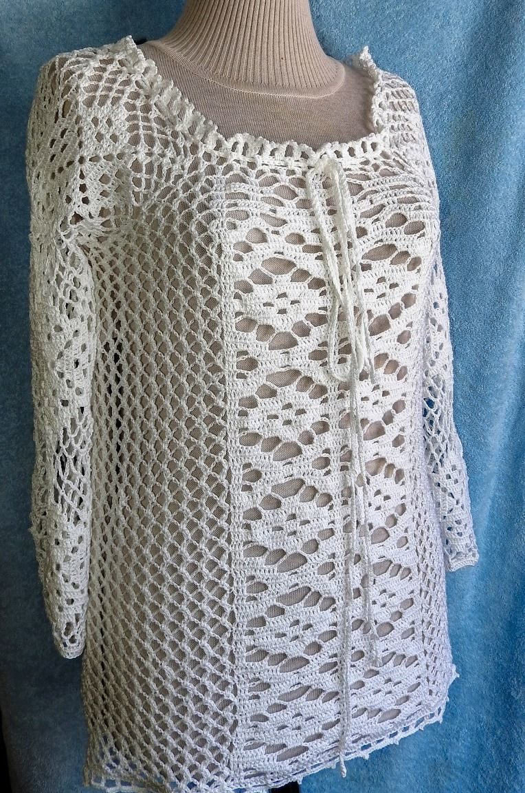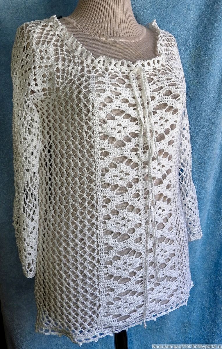Следват няколко варианта за блузи, които могат да се плетат от памук, коприна или смесени влакна с различна дебелина с помощта на кука за плетене на една кука.