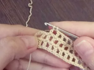 - В 3-тото око на основата се забива кука, изважда се преждата и се изтегля 1 око с 1 наметка.