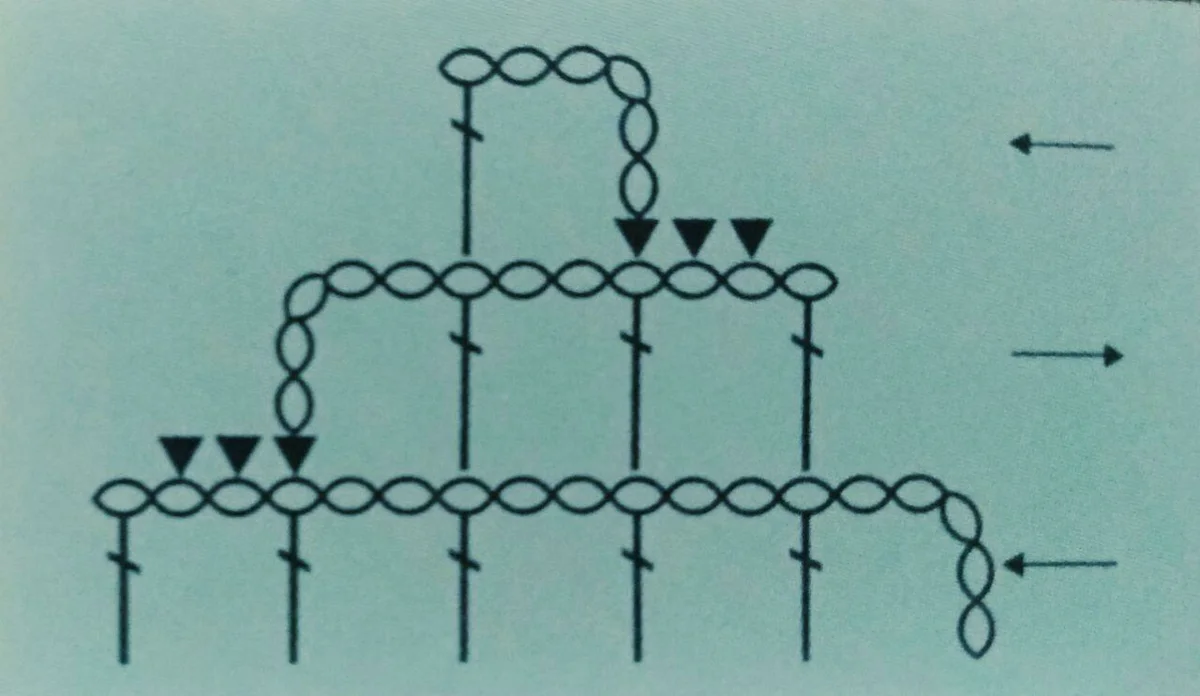 - 2 бримки. И отново повтаряме 1 акцент с 1 акцент. Така се оформя мрежа от бази.