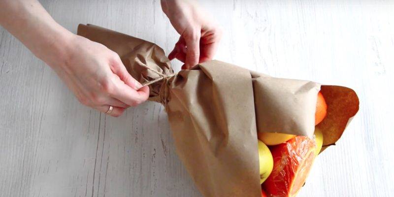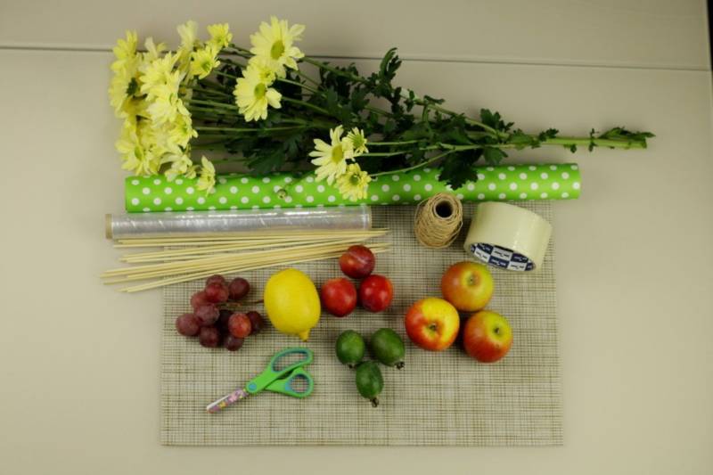 За този майсторски клас трябва да приготвите различни сезонни плодове, за да изглежда букетът апетитен и цветен. Важни са също така декорацията и хартията, в която е увит полученият дизайн. Това е крафт хартия в светлокафяв нюанс, който изглежда стилно: