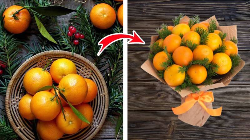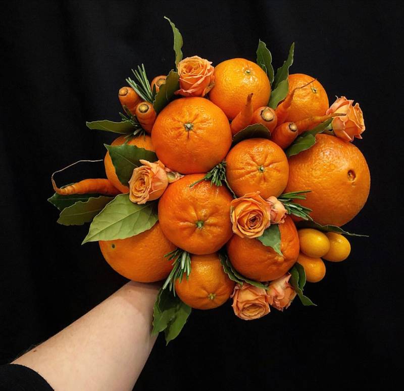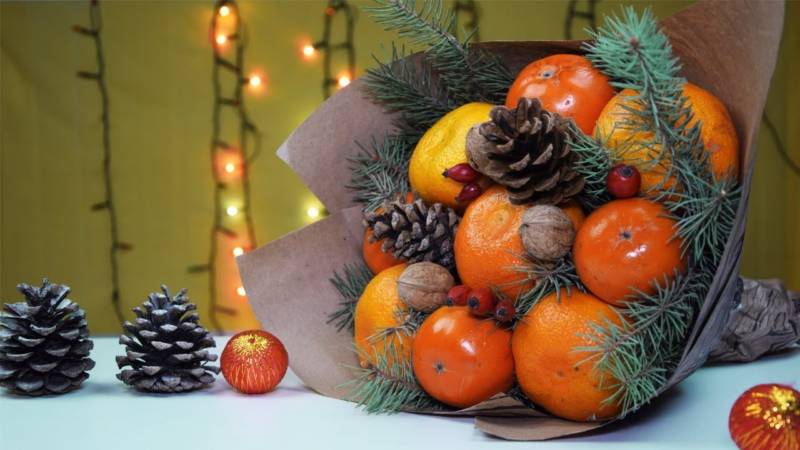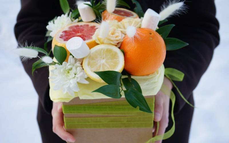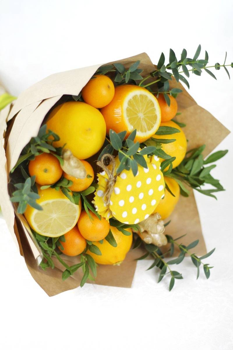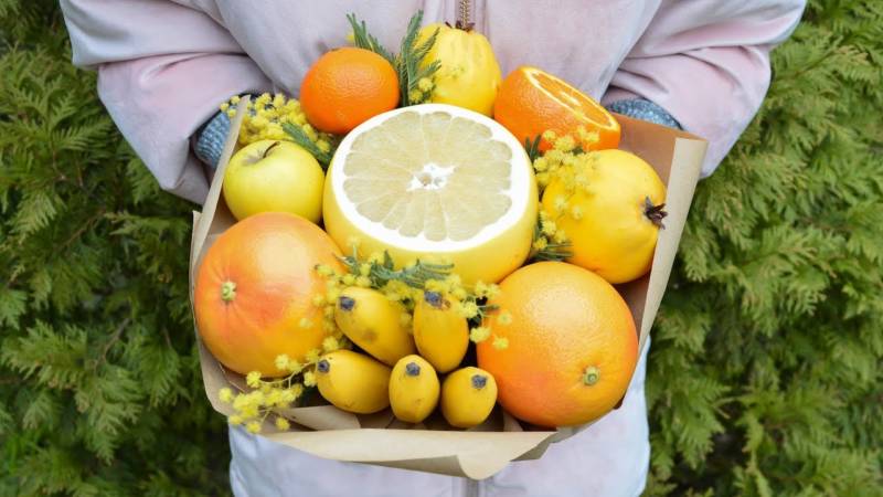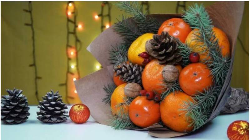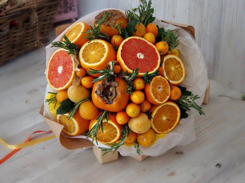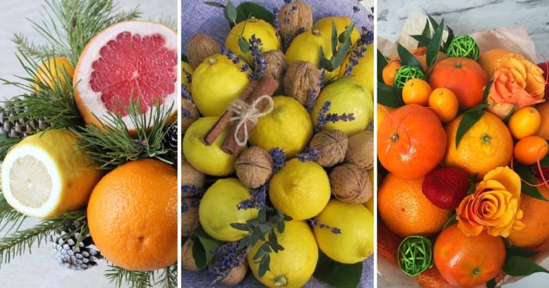 Цитрусовият букет е подходящ за зимните празници. Ако приятели ви поканят да се присъедините към тях в новогодишната нощ, не забравяйте да им поднесете като подарък здравословен, ароматен и вкусен цитрусов букет.