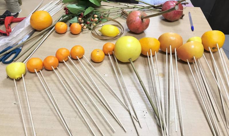 - Трябва да се приготвят лимон, портокал, нар и киви. Дълги дървени клечки за зъби, ножици, пласт фолио, канап и няколко пръчици канела са полезни за закрепване.