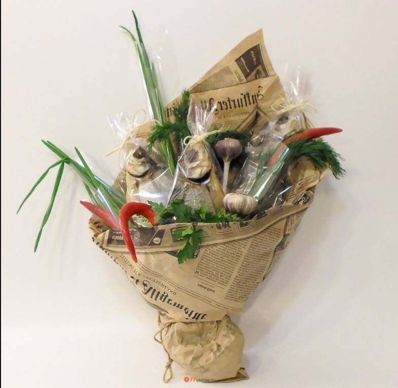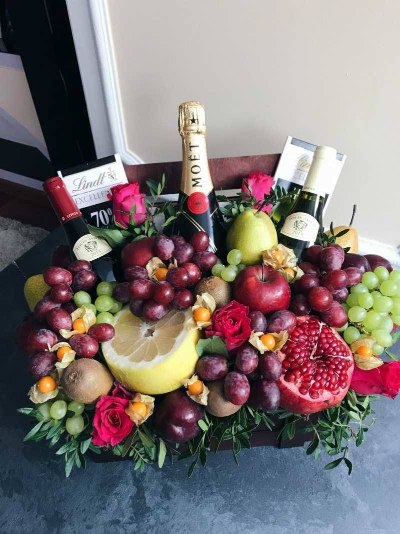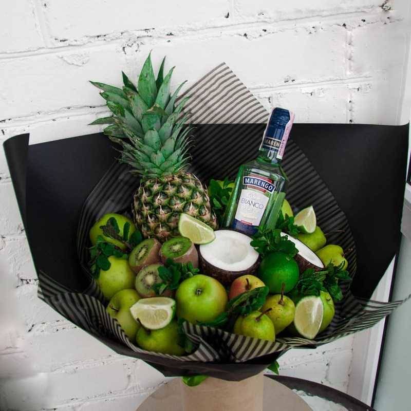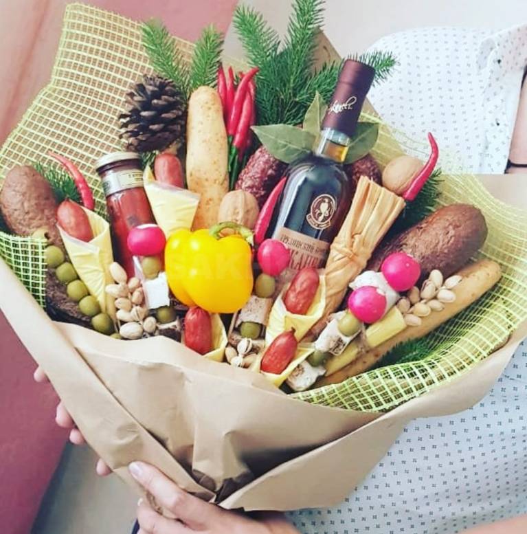 - Букет от плодове с добавка от бутилка алкохол, червени чушки, колбаси и сирене ще се хареса на мъжа, който обича да се забавлява с приятелите си в барове и докато гледа спорт.