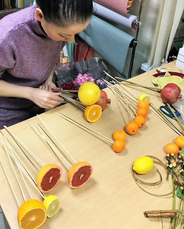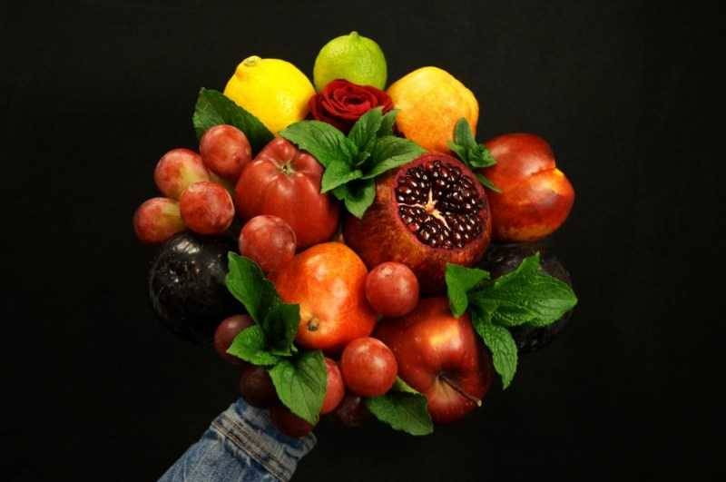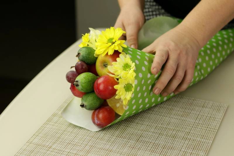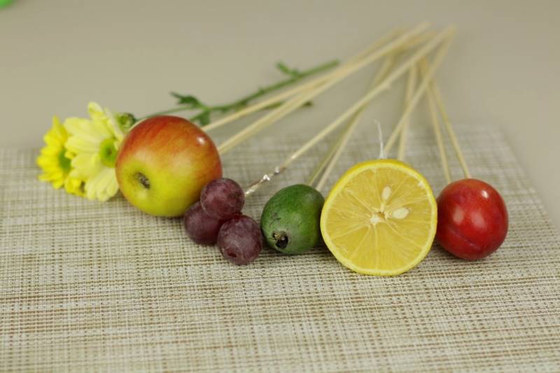 - Преди да направите букета, всички плодове трябва да се измият добре под течаща вода, след което да се подложат на пълно изсушаване. Чистият и сух отвън плод може да се аранжира в букета;