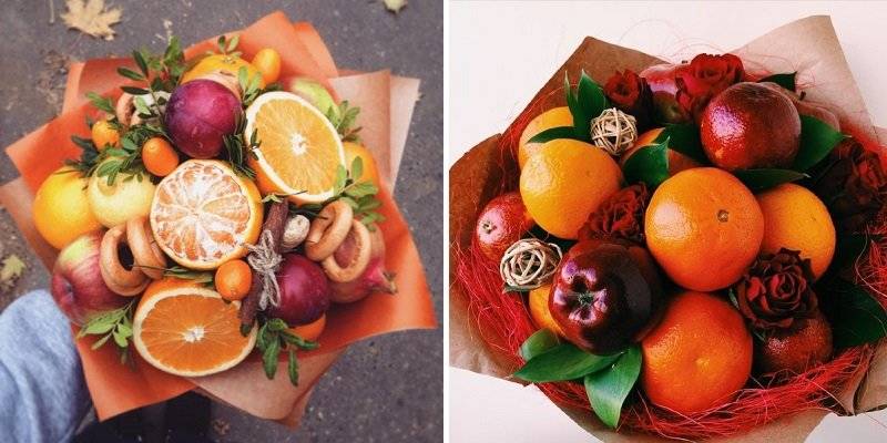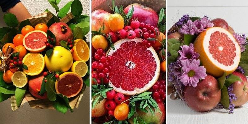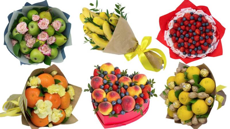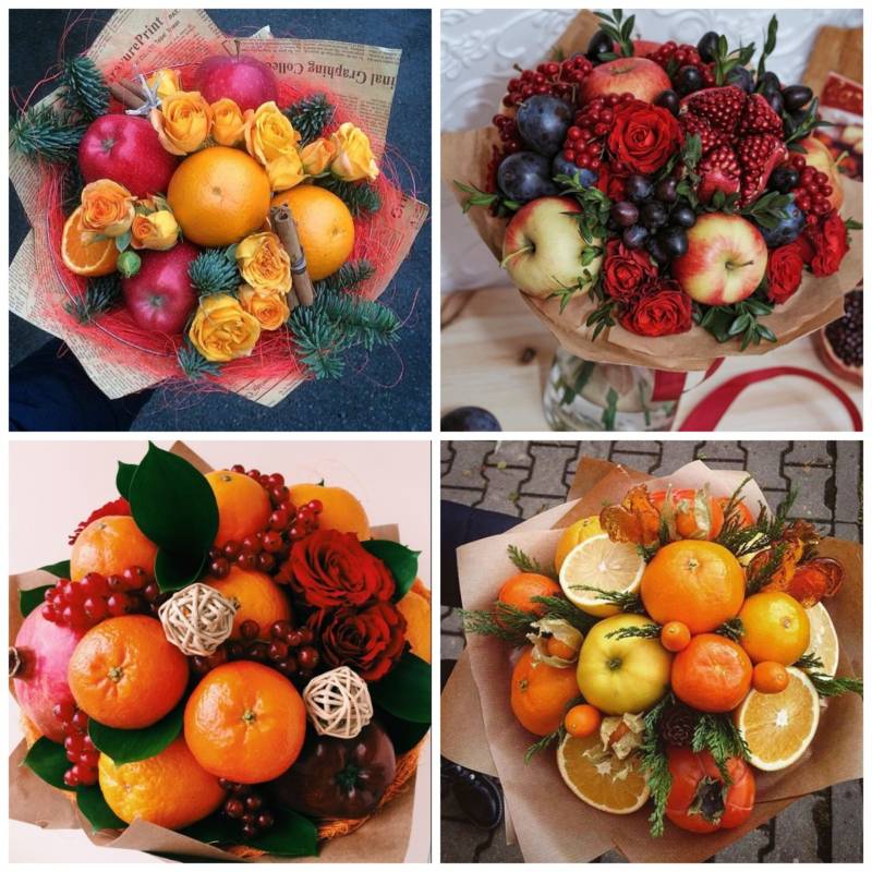 Съществуват различни видове букети и всеки от тях в състава си се вписва като подарък за определен празник. През зимата например се търсят цитрусови плодове, тъй като те са ароматни и съдържат витамин С, необходим за укрепване на имунната система. През лятото се предпочитат различни букети от горски плодове.