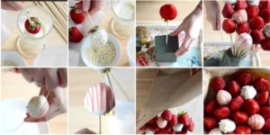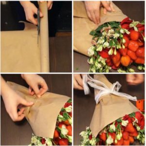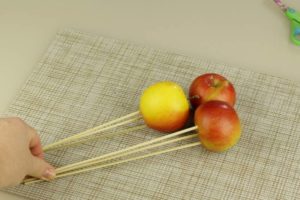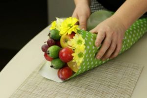 - Готовият плод се нанизва на дълги клечки за зъби, които от долната страна се придържат с няколко снопчета тиксо. Получената конструкция се увива с красива хартия, която в основата, където се държи букетът, се завързва с дебела сатенена панделка в цвят, който е в хармония с цвета на опаковката.