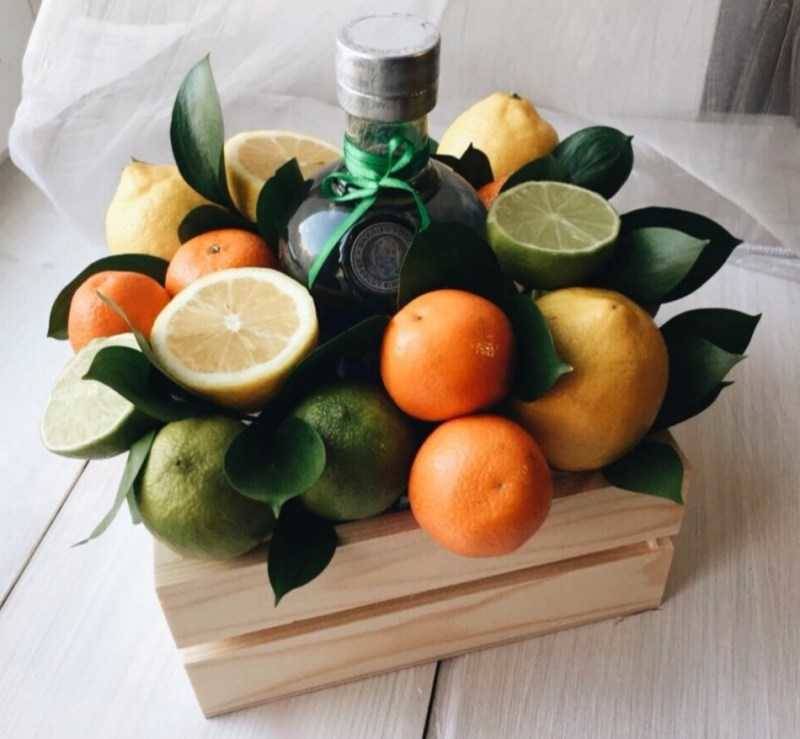 Една много интересна и ефективна техника за създаване на плодов букет е да се впръска малко количество качествен алкохол в цитрусовите плодове с помощта на спринцовка. Това прави цитрусовите плодове по-ароматни и удължава срока им на годност. Но тези букети са предназначени само за лица над 18 години!