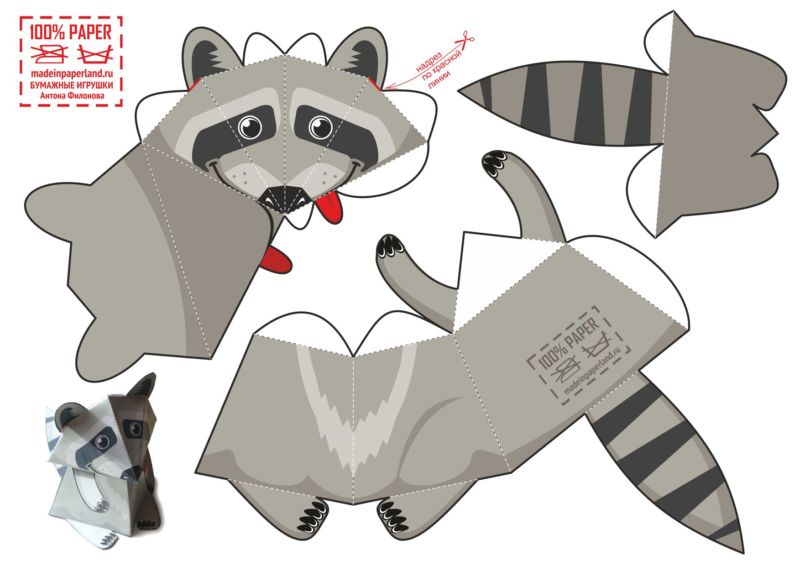 Тук всичко е просто, разпечатайте готов шаблон на животно, което ви харесва, и го изрежете. След това сгънете фигурата по линиите на сгъване и я залепете по специалните линии. Нарисувайте детайли като очи, мустаци и т.н.