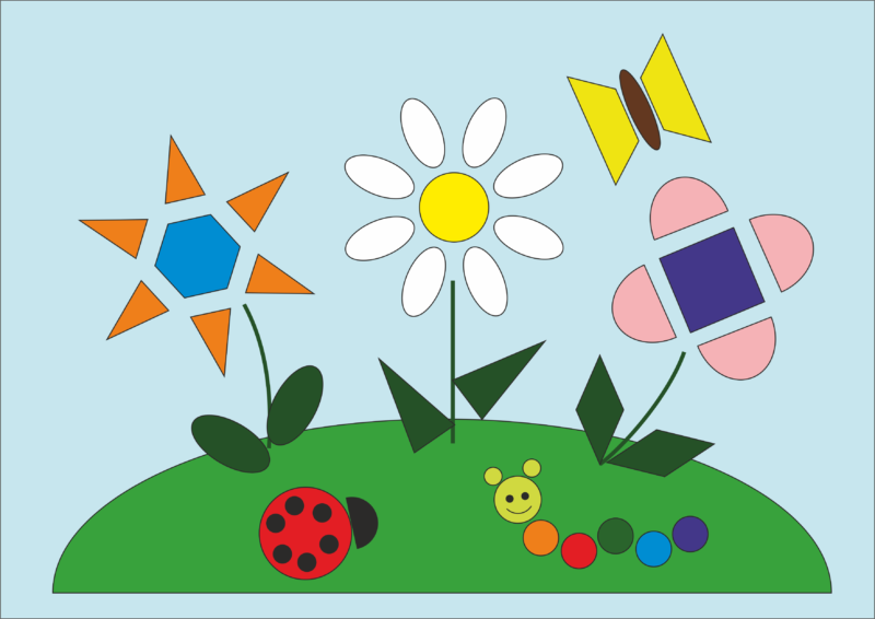 - Пригответе: пет равностранни триъгълника в червено, пет в жълто и пет в синьо, три малки кръга от кафява хартия, един голям правоъгълник в оранжево.