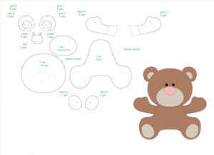 - От материала с кафяв цвят изрежете по 2 части на торса с лапички и главата. Също така 4 елемента на ушите.