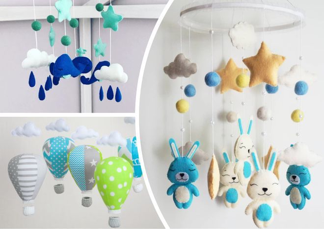 Тази конструкция се окачва над бебешкото креватче. Той привлича и разсейва детето. Можете да си купите готов мобилен телефон от пластмаса в магазин. Но е по-добре да го ушиете сами за бебето си:
