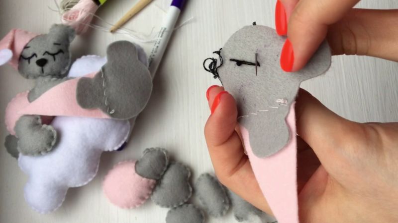 - Бродирайте очите и устата с черен конец, залепете носа от черен филц.