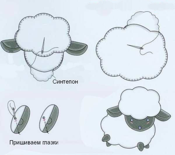 - Сгънете елементите и зашийте първо бежовата, а след това бялата част на овцата.