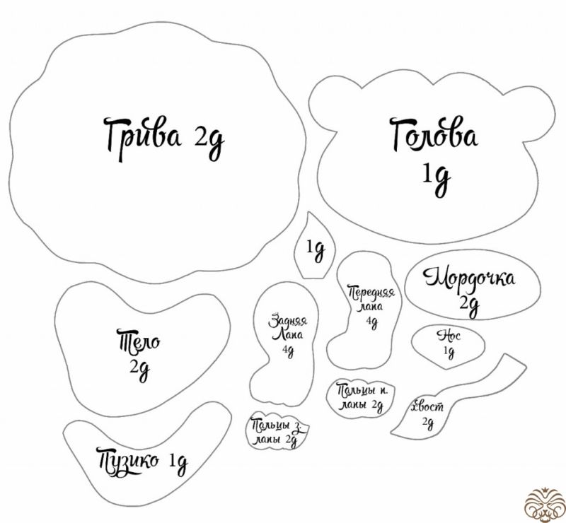 Създайте 2 части от тялото на лъва от светлокафяв филц заедно с къдрава грива: