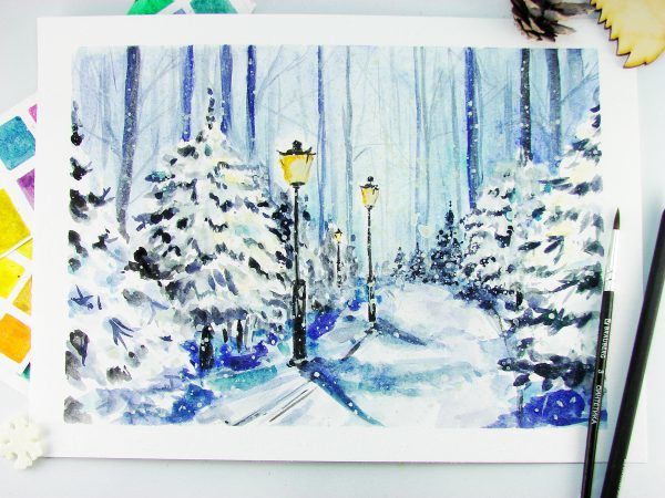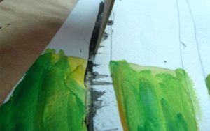 Отгоре се нанася типичен модел с къси и тънки черни линии. Трудно е да се нарисува ясна картина на пищна корона с боя, както и с молив. По-добре е дърветата да се приближат или отдалечат спрямо цялостната композиция.