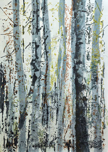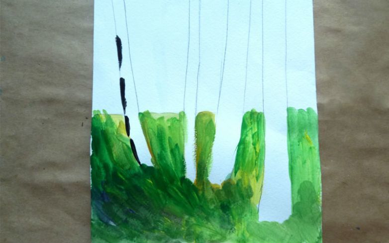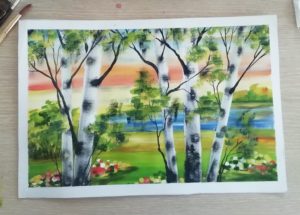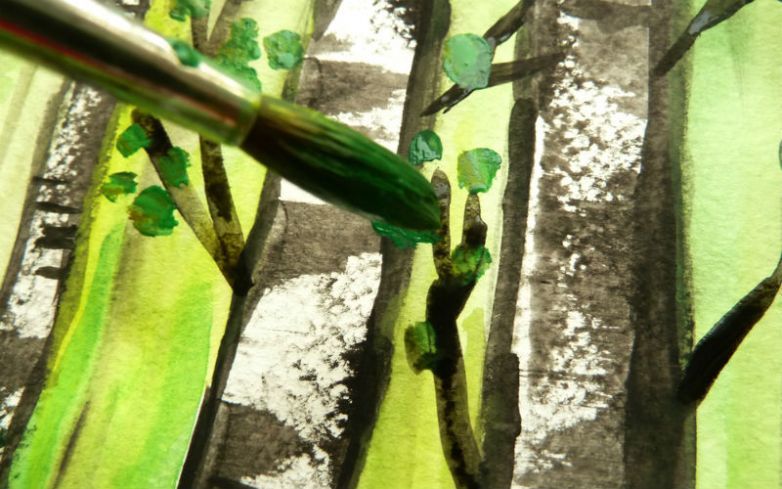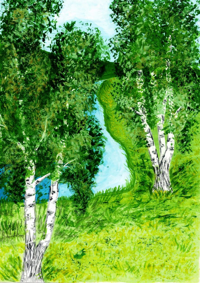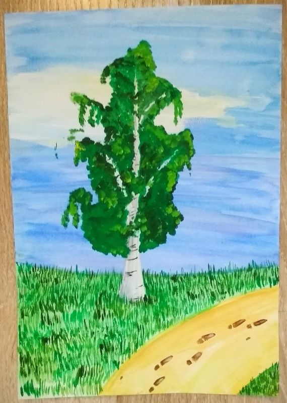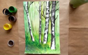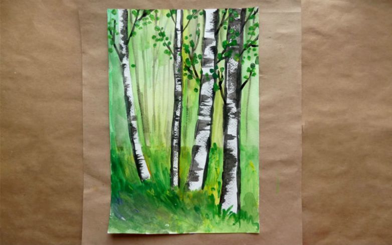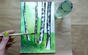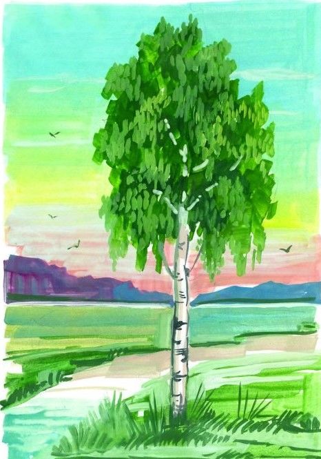 Красиво изрисувана бреза през лятото. Гвашът с маскировъчна лента ще създаде интересна картина. Използва се техника на забелязване.