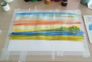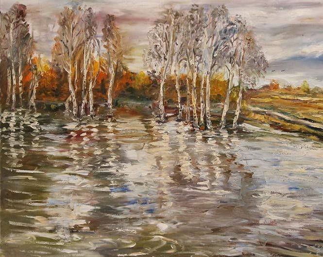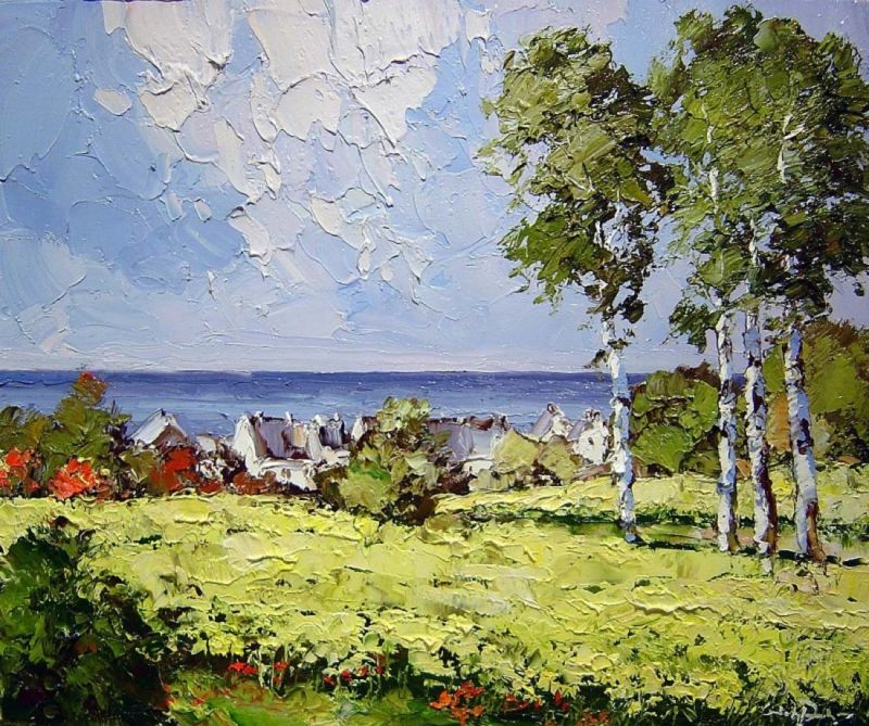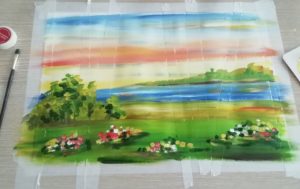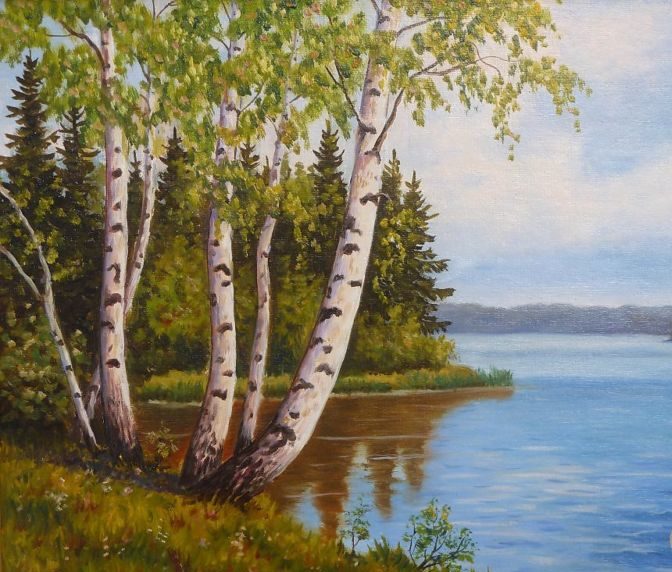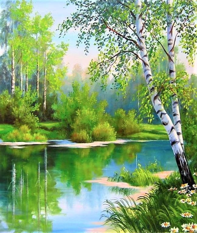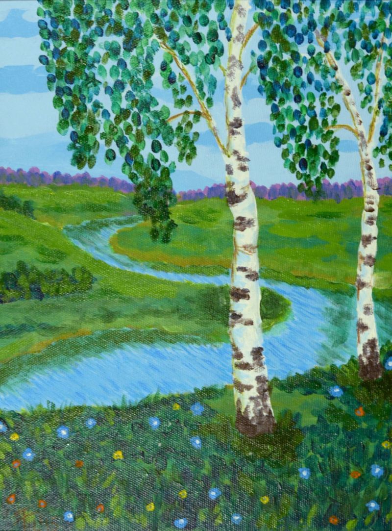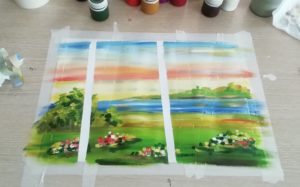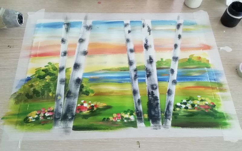 Тук синята боя се нанася на точки, като колкото по-ниска е границата на небето, толкова по-светъл нюанс се използва. В този интервал може да се използва малко бяло, за да се симулира леко облачно небе. След това се нанася зелена боя, която ще наподобява брезови листа.
