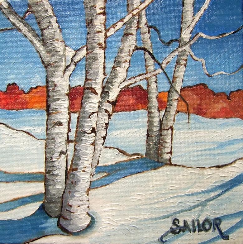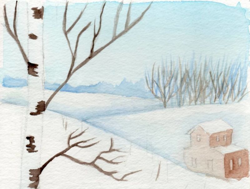 Голите брези на фона на бял сняг изглеждат добре. Зимният пейзаж в брезово дърво е не по-малко впечатляващ от свежия пролетен или летен вариант в зелено. Не е трудно да се нарисува такава картина. Необходими са цветовете бяло, черно и синьо.