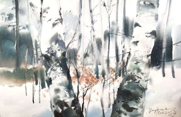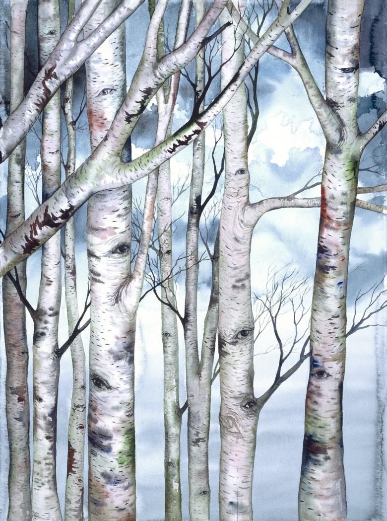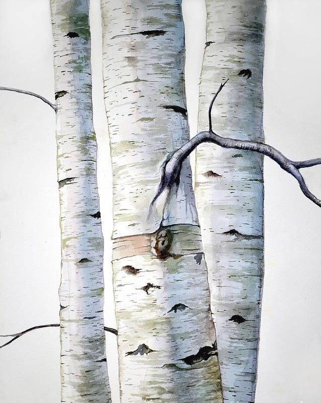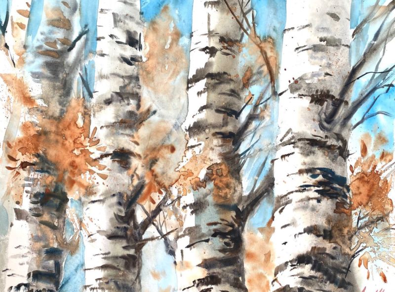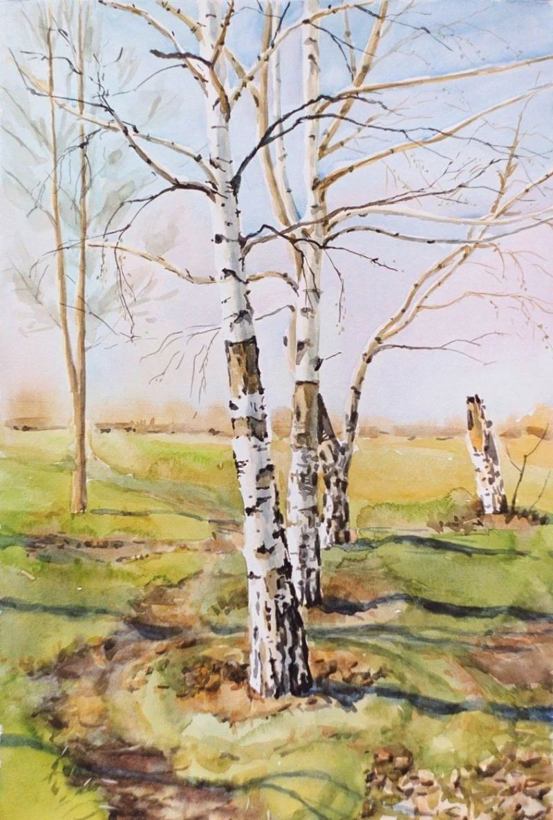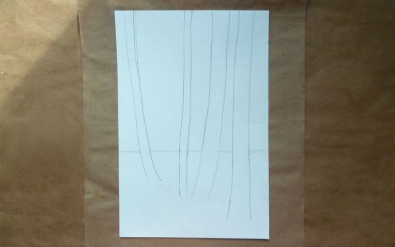 Очертанията на стволовете са направени с тъмен цвят, но линиите са слаби, този елемент не трябва да привлича вниманието. Стволовете са боядисани в бяло, а щрихите могат да бъдат груби, което създава впечатление за релефна кора.