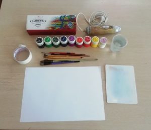 Готовата рисунка може да се оцвети с моливи, флумастери или други подходящи канцеларски материали.