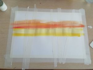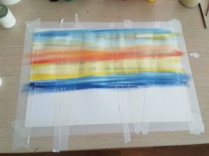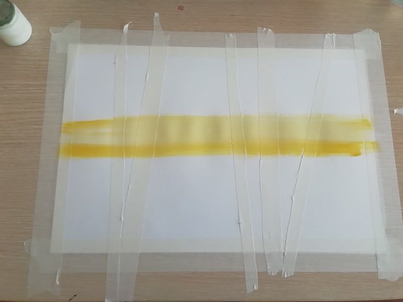 Започнете с поставянето на ленти от маскировъчна лента върху основата. Те ще бъдат основата на бъдещите стволове на брезите. Това се взема предвид при изрязването на лентите. Не е задължително те да са равномерни и еднакви по формат. Всяка лента трябва да наподобява ствола на дърво. Нанасянето на боята започва с оформянето на зоната на небето.