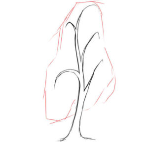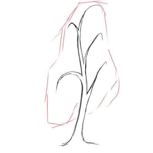 Това е гладък, издължен триъгълник или просто удебеляване на предварително начертаната линия с постепенно разширяване надолу. От получения ствол могат да се нарисуват или скицират клони. Не е необходимо да го правите.