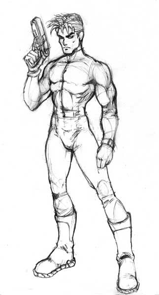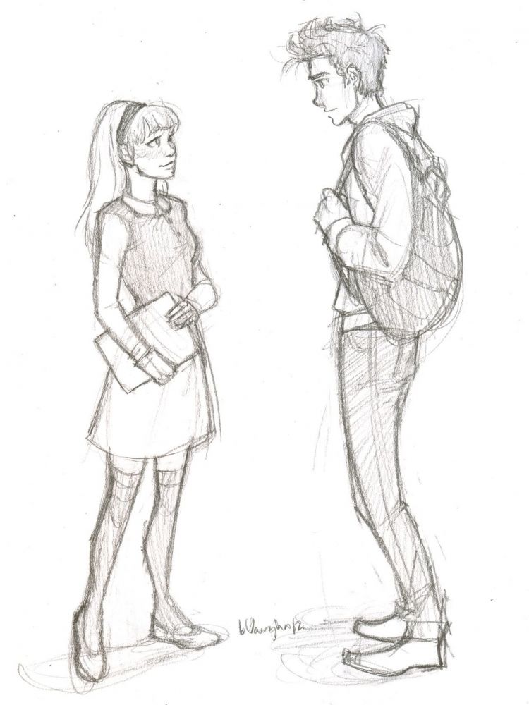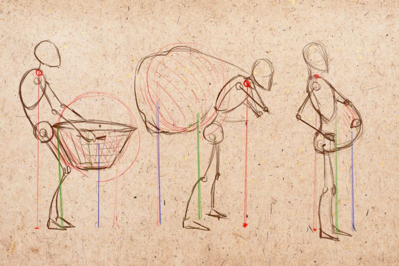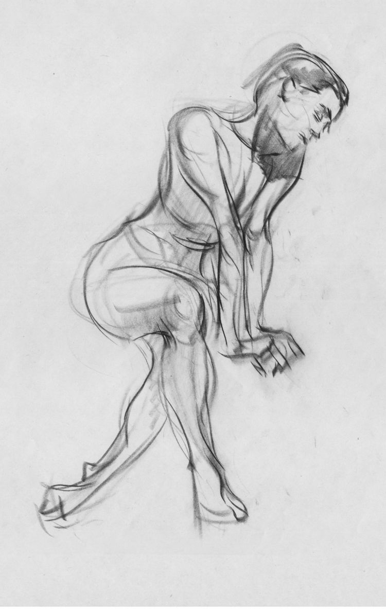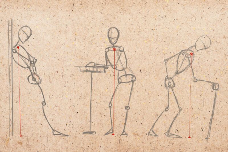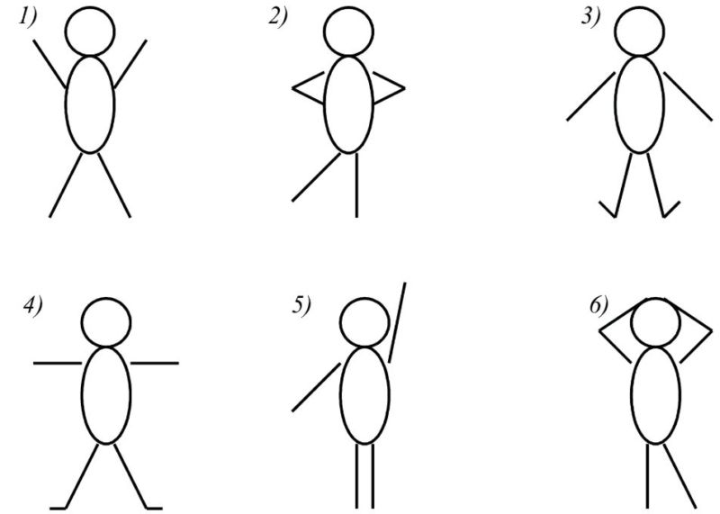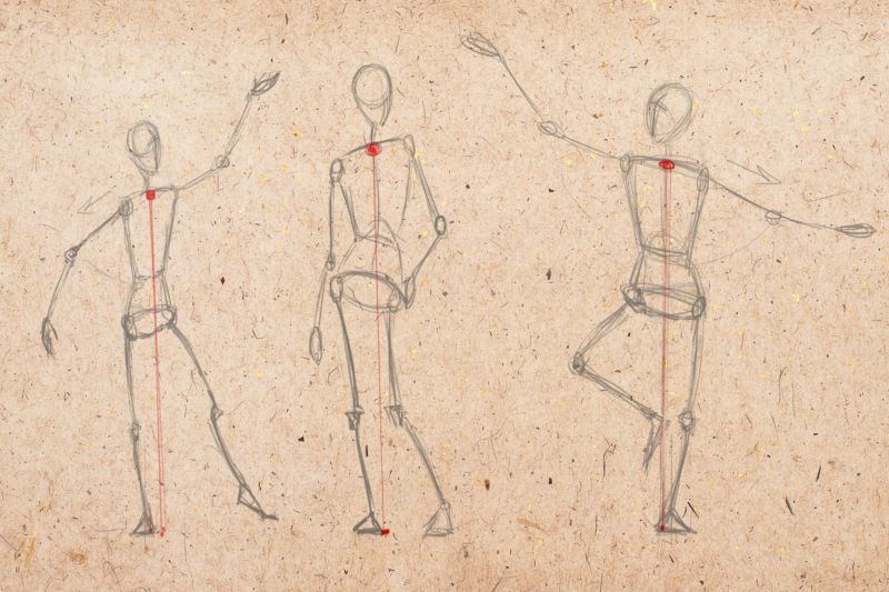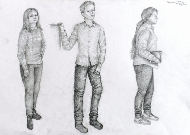 Този път може да се нарисува човек, който стои в цял ръст, но не изправен, а в поза - обръща глава настрани, вдига ръка, прави крачка встрани и т.н. Важни са не толкова силуетните линии, колкото анатомичните точки, които предават движението в скицата: