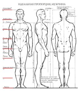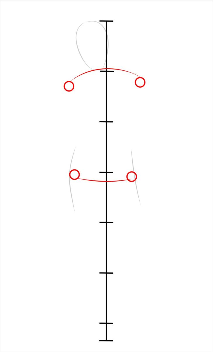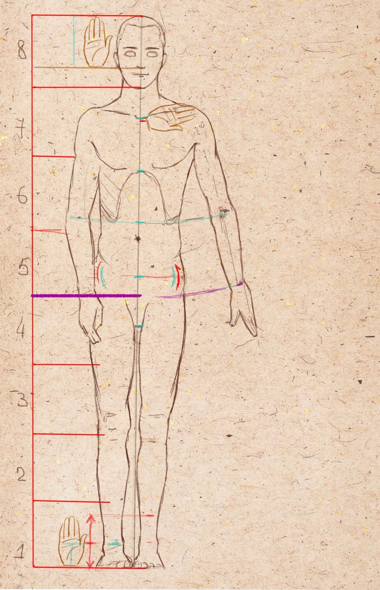 Шията трябва да заема горната третина на следващия сектор по координатната ос. Всяко рамо е със същата ширина като главата, малко по-малко. Предмишниците на ръцете ще заемат две трети от този сектор и целия долен сектор.