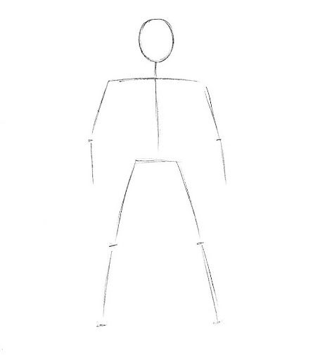 В този случай е необходимо да се начертаят само прави линии на костния апарат на ръцете и краката. Черепът се рисува като овал, който се стеснява надолу, със или без детайли.